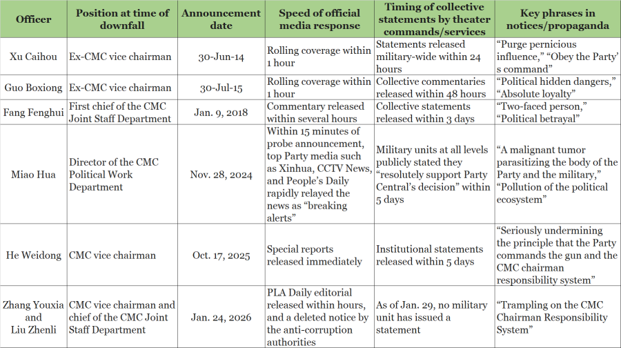 - CCP official media, the PLA Daily, and the various theater commands have not issued commentaries or statements expressing support for the central leadership’s decision regarding Zhang and Liu. This contrasts with past cases involving investigations of senior PLA officers (see table below).